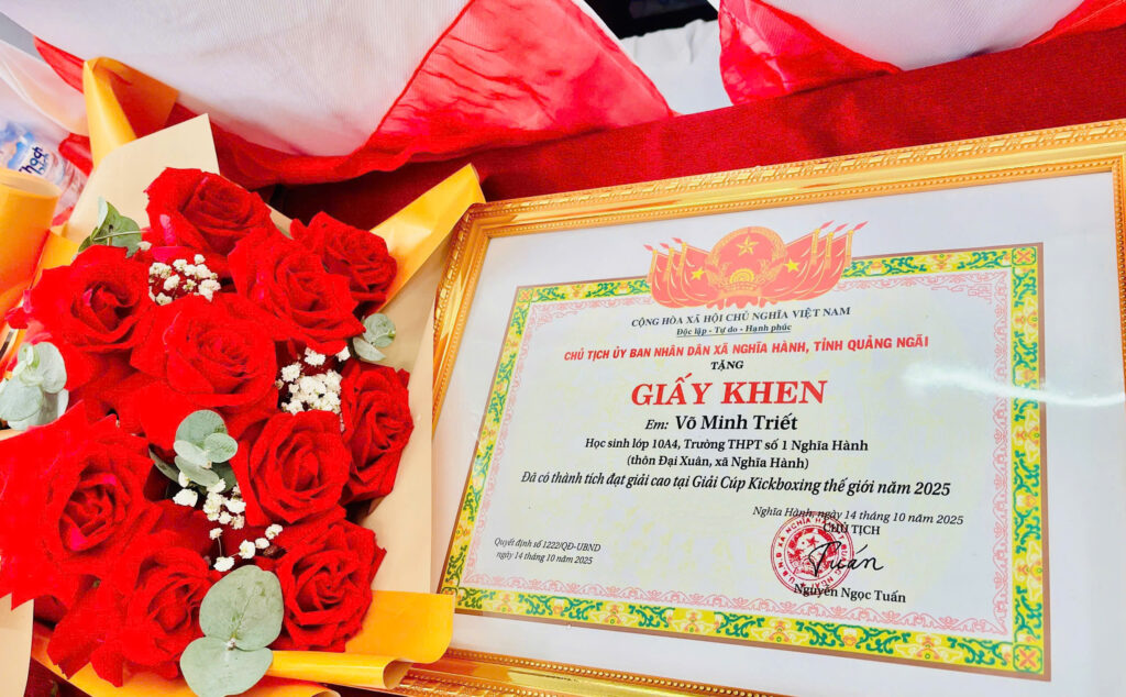 Sáng 15/10/2025, UBND xã Nghĩa Hành cũng đã long trọng tổ chức lễ tuyên dương và trao giấy khen cho Võ Minh Triết, ghi nhận những nỗ lực và thành tích xuất sắc của anh trên đấu trường quốc tế.