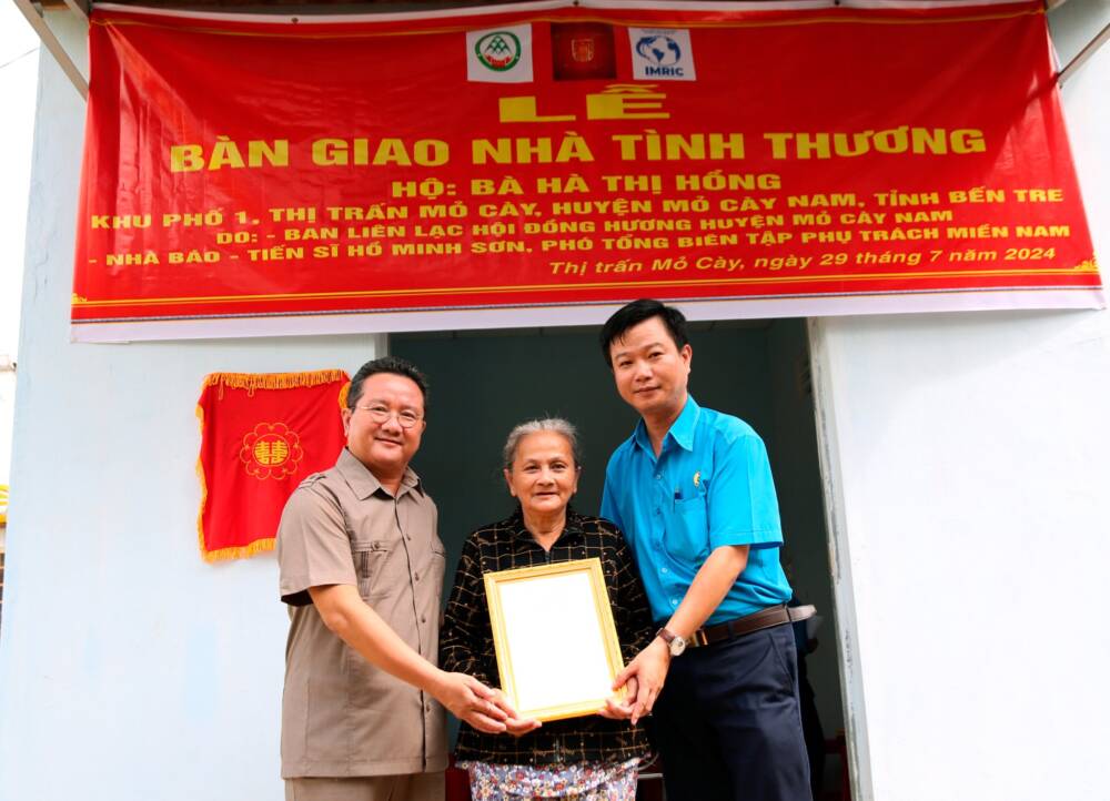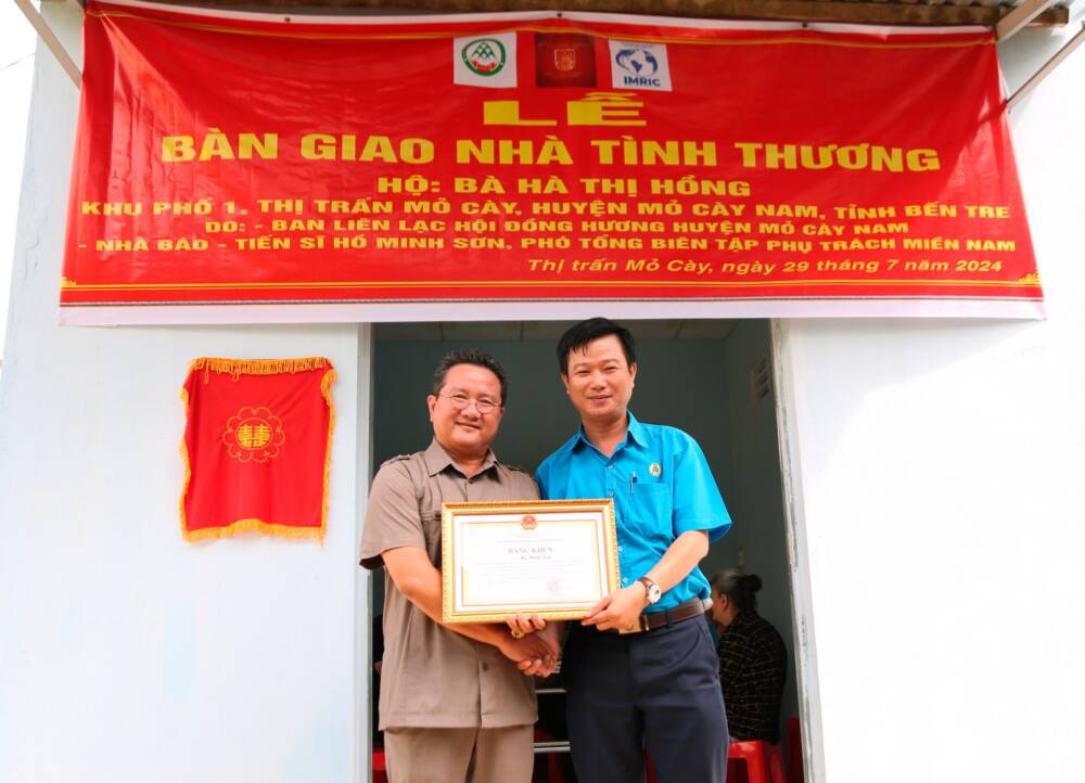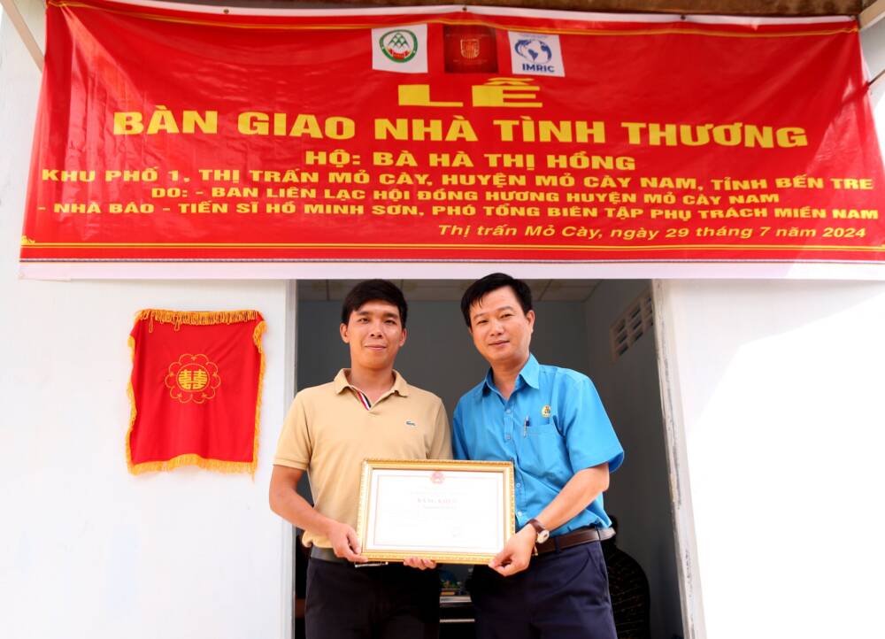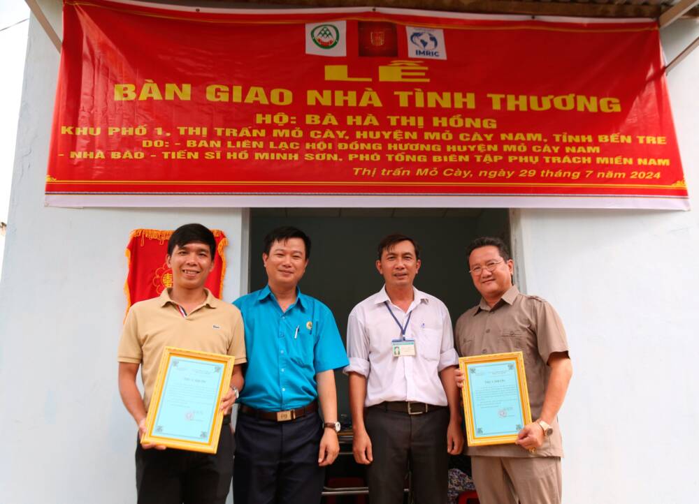Sáng ngày 29/07/2024, Viện Nghiên cứu Thị trường – Truyền thông Quốc tế (IMRIC), Viện Nghiên cứu Chính sách pháp luật&Kinh tế hội nhập (IRLIE) phối hợp với Tạp chí Doanh nghiệp và Trang trại Việt Nam, UBND Thị trấn Mõ Cày, huyện Mõ Cày Nam, tỉnh Bến Tre tổ chức lễ bàn giao căn nhà tình thương cho hộ bà Hà Thị Hồng là Hộ cận nghèo, thường trú tại địa phương.