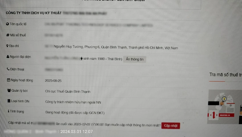 Như đã đưa tin, mới đây, trước Tết, ông L tra cứu mã số thuế bằng CCCD trên hệ thống điện tử thì tá hỏa phát hiện mình đang là giám đốc một công ty có trụ sở ở phường 6, quận Bình Thạnh.