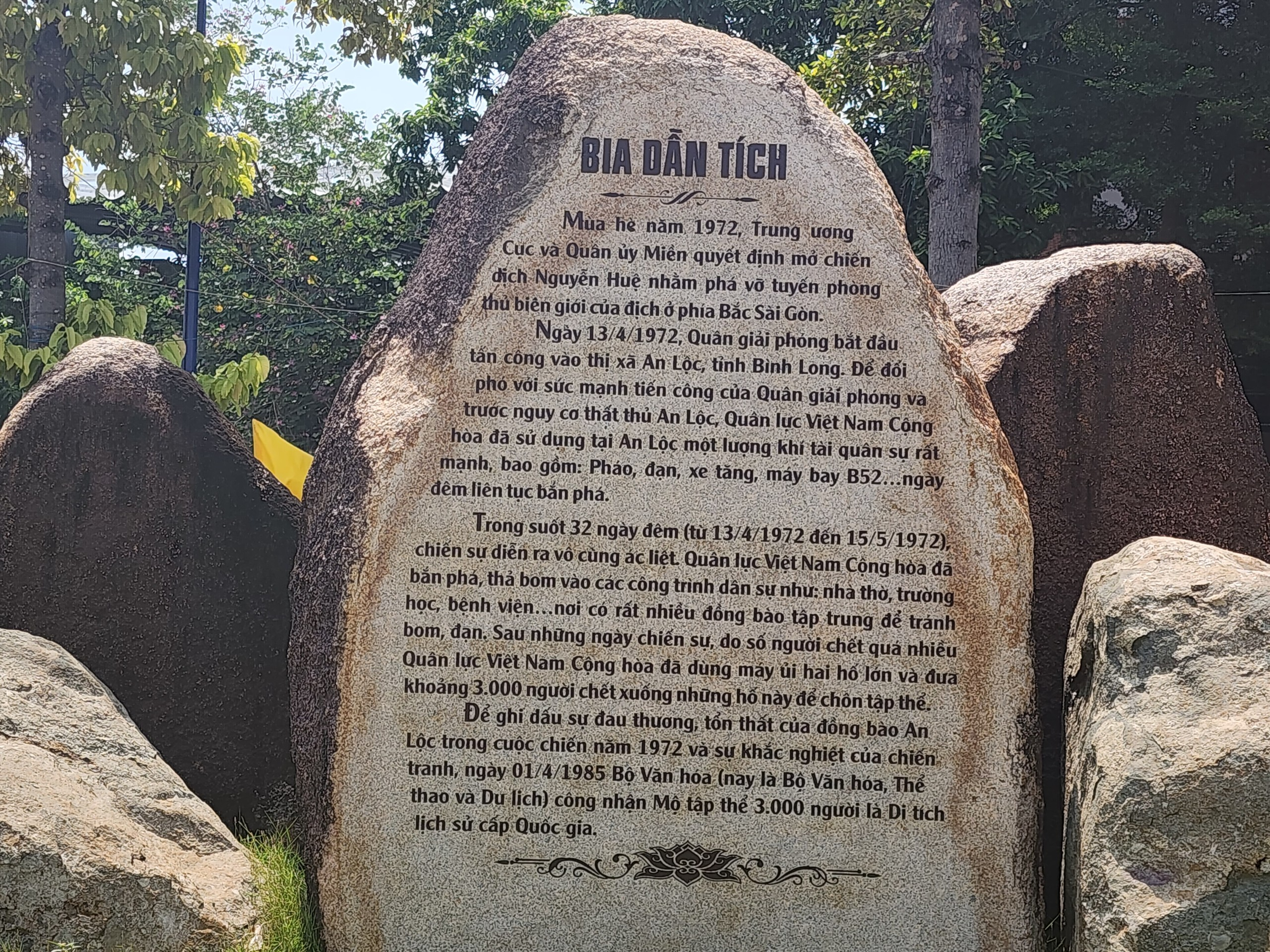 Với diện tích của khuôn viên rộng hơn 4.000m2, gồm khu mộ tập thể, nơi chôn cất hàng ngàn người dân vô tội ở khu vực thị trấn An Lộc xưa và trong đó có cả binh lính Việt Nam Cộng hòa. Đó là hệ quả tày trời mà binh lính Mỹ gây ra trên lãnh thổ Việt Nam. Hơn 3.000 người dân An Lộc vô tội đã ngã xuống, hệ lụy của 32 ngày đêm Mỹ điên cuồng đánh phá Việt Nam trong chiến dịch Nguyễn Huệ hòng giữ Bình Long để giữ cho được Sài Gòn. Thế nhưng, “lấy trí nhân để thay cường bạo”, dù Mỹ đã sử dụng các phương tiện tối tân, hiện đại với B52 đánh phá, nhưng mọi cuộc chiến phi nghĩa đều thất bại. Tuyến quốc lộ 13 được giải phóng, thông tuyến, quân chủ lực Việt Nam tiến về Sài Gòn làm nên đại thắng mùa xuân năm 1975, giải phóng hoàn toàn miền Nam, thống nhất đất nước.