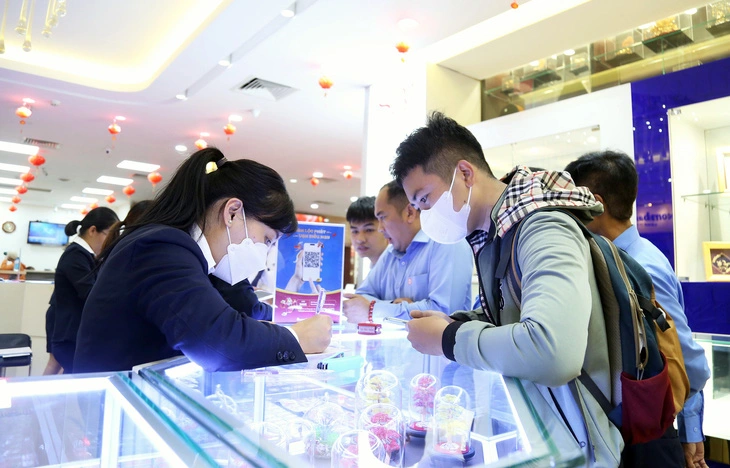 Người dân thanh toán tiền khi mua vàng tại TP.HCM - Ảnh: PH.QUYÊN